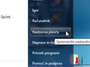 Najprej kliknimo na gumb Start in nato izberemo še Nadzorna plošča.