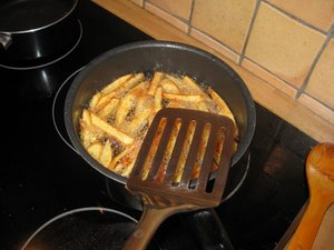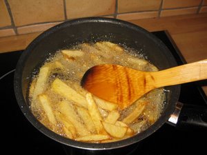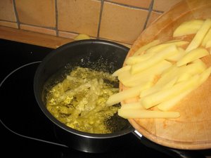 Ko bo olje segreto, boste to videli. Dodajte v segreto olje narezan krompirček. Krompirček se bo začel v olju takoj cvreti. |