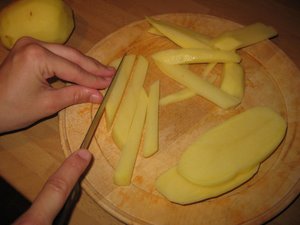 Sedaj pa vzemite nož in začnite krompir rezati na rezine. Potem pa primite dve ali več rezin in ga narezite še počes, da boste dobili podolgovate koščke (glej sliko). |