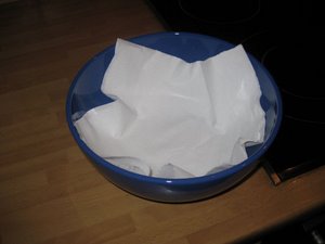 Potem malo počakajte, da se olje segreje in vmes pripravite večjo posodico ter v njo dodajte liste papirnate brisače. |