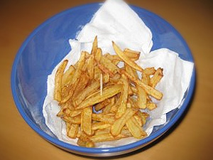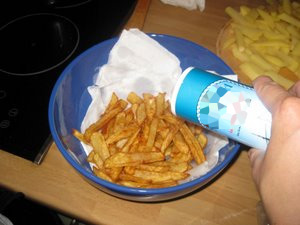Vzemite del papirnate brisače in popivnate olje na krompirčku. Dodajte še sol in premešajte krompirček. |