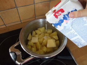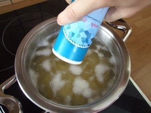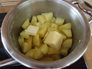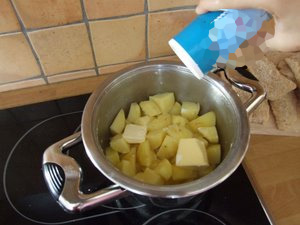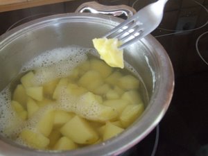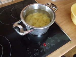 Naredite isto še z nekaj krompirji, katere potem postavite v posodo z vodo. Postavite posodo potem na kuhalno ploščo in nastavite najvišjo temperaturo. |