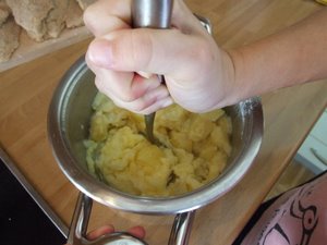 Vzemite tlačilko ter začnite krompir z maslom in mlekom gnesti, dokler vam zmes ne bo postala všeč. Z zajemalko pripravljen krompir postrežite. |