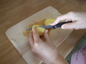 Vzemite krompir, ga umijte potem pa ga z rezilom za krompir olupite. Vzemite navaden nož in začnite krompir rezati na male koščke. |
