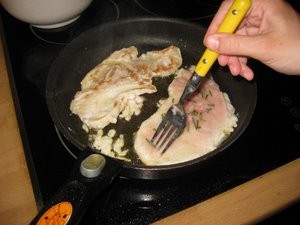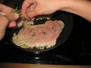 Počakajte, da je spodnja stran dobro zapečena, nato zrezka še enkrat obrnite, da se rožmarin popeče in da dobita zrezka rdeče rjavo barvo.