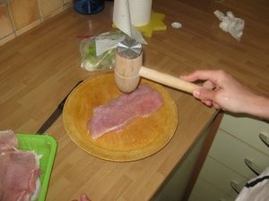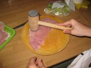 Razgrnite zrezke na leseno desko in jih nekajkrat potolčite s kladivom.