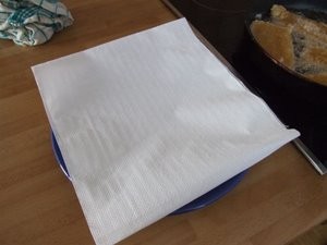 Med pečenjem pripravite krožnik na katerega dajte 2 ali 3 liste papirnate brisače. |