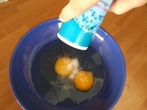 Postopek ponovite še z enim jajcem, nato pa dodajte nekaj ščepcev soli. Dobro ju premešajte z metlico. |