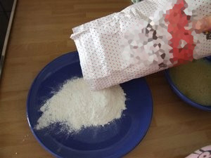 Na plitek krožnik dajte nekaj moke, toliko, da prekrijete krožnik. |