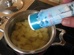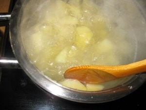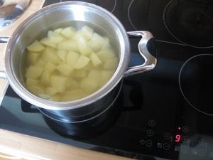 Ko je ves krompir narezan na koščke, ga prestavite v večjo posodo z vodo. Dolijte toliko vode, da je prekrit ves krompir in še malo čez. Sedaj posodo postavite na kuhalno ploščo in nastavite najvišjo temperaturo. |