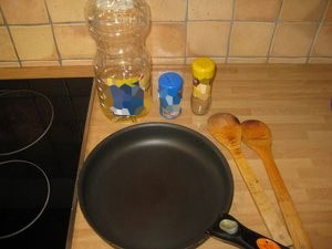 Med kuhanjem pripravite ponev, kuhalnico, začimbe (jaz bom uporabil vegeto) ter olje. |