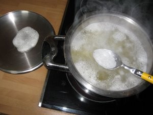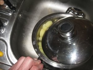 Ko je kuhan, posodo prekrijemo s pokrovko in jo nagnemo v umivalnik ter odlijemo vso vodo. |