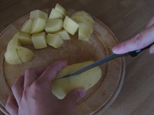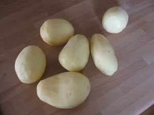 Z lupilnim ali navadnim nožkom olupite krompir. Pripravite si ga toliko, kolikor ga boste pojedli. Nato ga splaknite pod vodo, da odstranite morebitno umazanijo. |