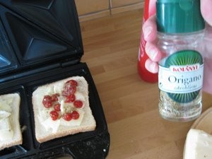 V mojem primeru sem naredil okus po pici margeriti, vendar pa lahko v kruhek dodate še šunko itd.. Dodajte potem še en kruhek čez vsebino, tako da bo en del spodaj in en del zgoraj... |
