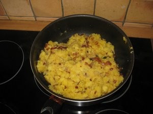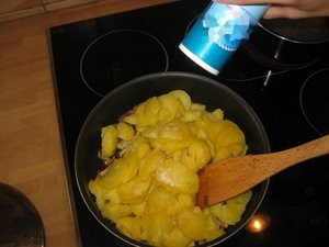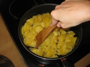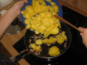 In ko bo čebula porjavela, stresemo vanjo ravnokar narezen krompir. |