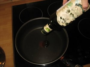 Postavite ponev na kuhalno plošči z nastavljeno srednje nizko temperaturo in v njo vlijte malo olivnega olja. |