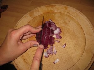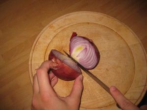 Med tem, ko se čebula praži, narežite krompir na rezine oziroma kose. |