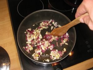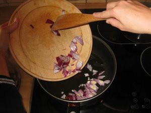Ko bo olivno olje segreto, dodajte še čebulo. |