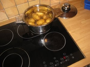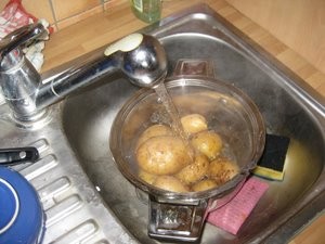 Pripravite krompir ga zložite v posodo in dolijte toliko vode, da je ves krompir pod vodo in še malo čez. |