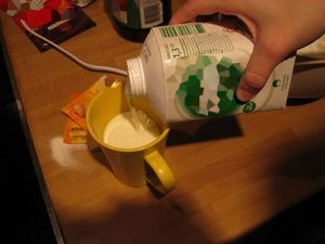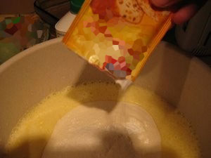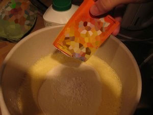 Nato odmertite dve skodelici moke in jo dodajte k jajcem. Nato dodajte še vrečko pecilnega praška. |