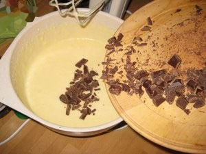 Vzemite jedilno čokolado in jo z nožem jo narežite na manjše kose. Naj vas ne moti, če se drobi. Dodajte jo k masi in premešajte. |