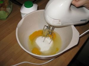 V skodelico odmerite sladkor in ga dodajte jajcem. Dobro premešajte, da dobite svetlo rumeno penasto zmes. |