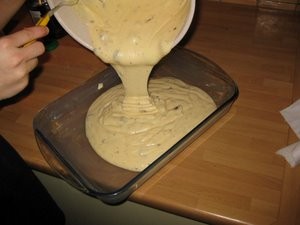 Pečico nastavite na 180 stopinj celzija, da bo dobro segreta, ko boste dali vanjo kolač. Sedaj vzemite maslo, odrežite košček in premažite z njim dno pekača. Lahko uporabite tudi olje, ki ga s prsti enakomerno porazdelite po dnu pekača. V pekač nato vlijte maso. |