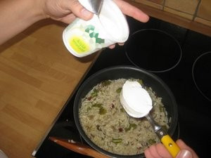 Dodajte polovico jušne kocke v rižoto. Sedaj kuhajte na srednjem ognju, dokler ne zmanjka vode. |