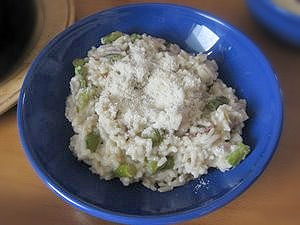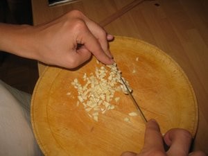 Ko čakamo, da se rižota skuha, vzamemo 3 stroke česna. Olupite ga in odrežite spodnji oleseneli del. Nato pa ga nasekljajte na majhne kosce. |
