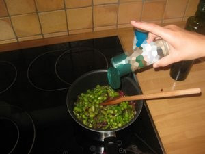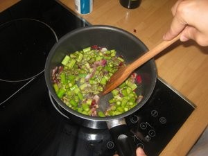 Ko čebula postekleni, dodajte šparglje in nekaj minut pražite oboje skupaj. |