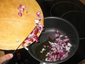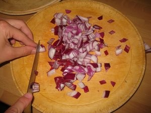 Nato vzemite čebulo in jo prerežite na pol. Narežite jo na rezine in nato še prečno na rezine, da dobite majhne koščke.Po potrebi koščke še dodatno nasekljajte, da bodo čim manjši. |