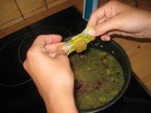 Nato dodate trikrat 2dl kozarce vode. Pol kozarca vode lahko tudi nadomestite z belim vinom.