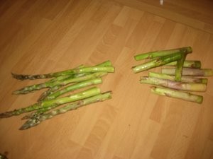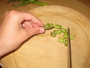 Umijte jih in nato narežite na približno 2cm dolge kosce. Zrežite vse šparglje, tudi cvet na koncu šparglja, ki je najbolj zdrav.