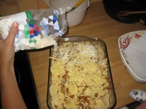 Nato posujte sojo. Enakomerno jo razporedite po krompirju. Potem pa vse skupaj ponovno prelijte z nekaj jajčne omake. |