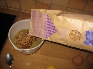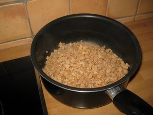 V posodo z jušno osnovo natresite sojine kosmiče.