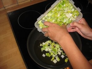 Pripravite ponev, vlijte nekaj žlic olja in pustite na visokem ognju, da se olje segreje. Nato dodajte por. Praži naj se 5-10 minut, katerega mešajte redno. |