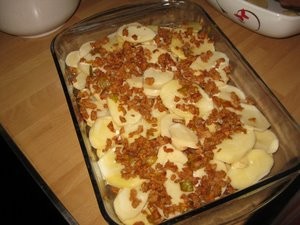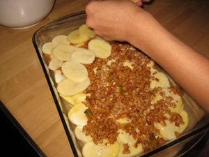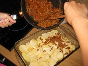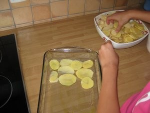 Nato začnite po dnu pekača zlagati rezine krompirja, enega zraven drugega. Krompir ste pripravili na začetku. |
