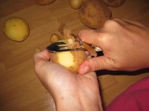 Med tem lahko začnete lupiti krompir in ga nato narezite na tanke lističe.