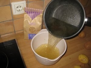 Ko bo jušna osnova raztopila, jo prelijte v večjo plastično posodo. |