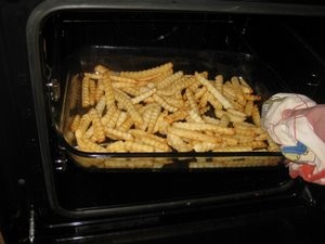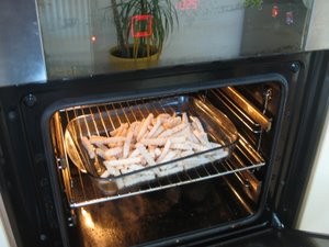 Na vrečki proizvajalca krompirčka vam tudi piše na kolikšni temperatri se mora peči. Jaz sem nastavil 225 stopinj.