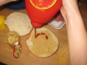 Vzemite ketchup in ga dodajte na namazano stranico kruha. |
