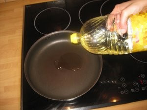 Ponev postavite na kuhalno ploščo z nastavljeno visoko temperaturo in v njo nalijte žlico olja. |