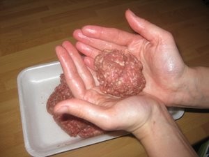 Vzemite okoli 400g začinjenega mletega mešanega mesa, ki ga zgnetete skupaj. |