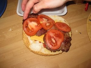 Na meso dodajte še pripravljen paradižnik in nato nanj še drugo polovico kruha. |