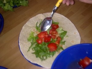 Sedaj pripravite prvo tortiljo in vanj dodajte nekaj mesa.