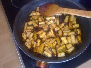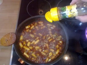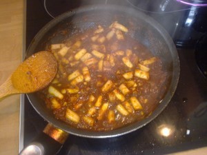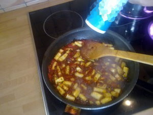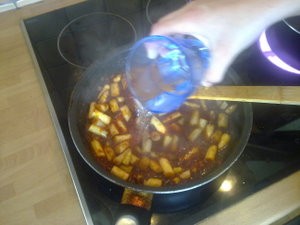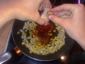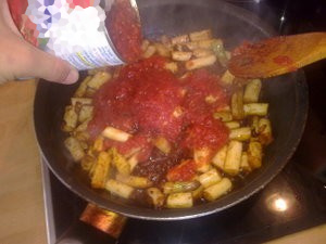 V ponev, ko vse bo vse malo popeklo, dodajte še paradižnikovo mezgo in seveda premešajte. |