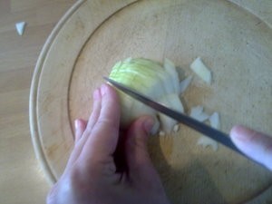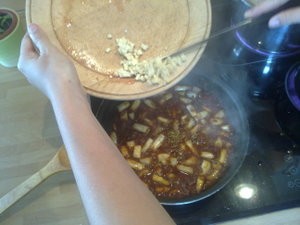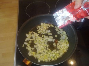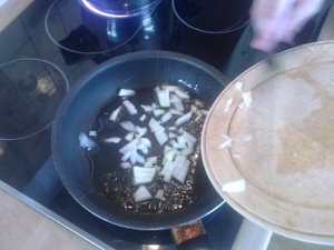 Potem ko bo olje zavrelo, dodajte sesekljano čebulo in z kuhalnico premešajte malo, da se bo lepše popekla. |