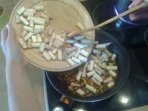 V lonec z testeninami dodajte pripravljeno jed s šparglji. |