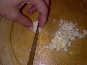 Vmes pripravite še dva stroka česna, ga olupite in nato sesekljate na male koščke. |