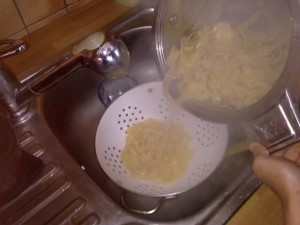 Sedaj vodo s testeninami z pomočjo cedila odlijte. |